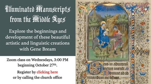 Many of you have participated in Gene Bream’s informative sessions which have included “A Pilgrimage to Chartres Cathedral”, “Glorious Stainte Chapelle à Paris”, “Da Vinci's “The Last Supper””, “Treasures of Van Gogh”, and “A Wild Truffle Hunt." Gene’s next Zoom offering will be a three-part series exploring the beauty and glories of Medieval Illuminated Manuscripts . Come join us for this journey as we trace the development of these stunning artistic gifts from the European Middle Ages.